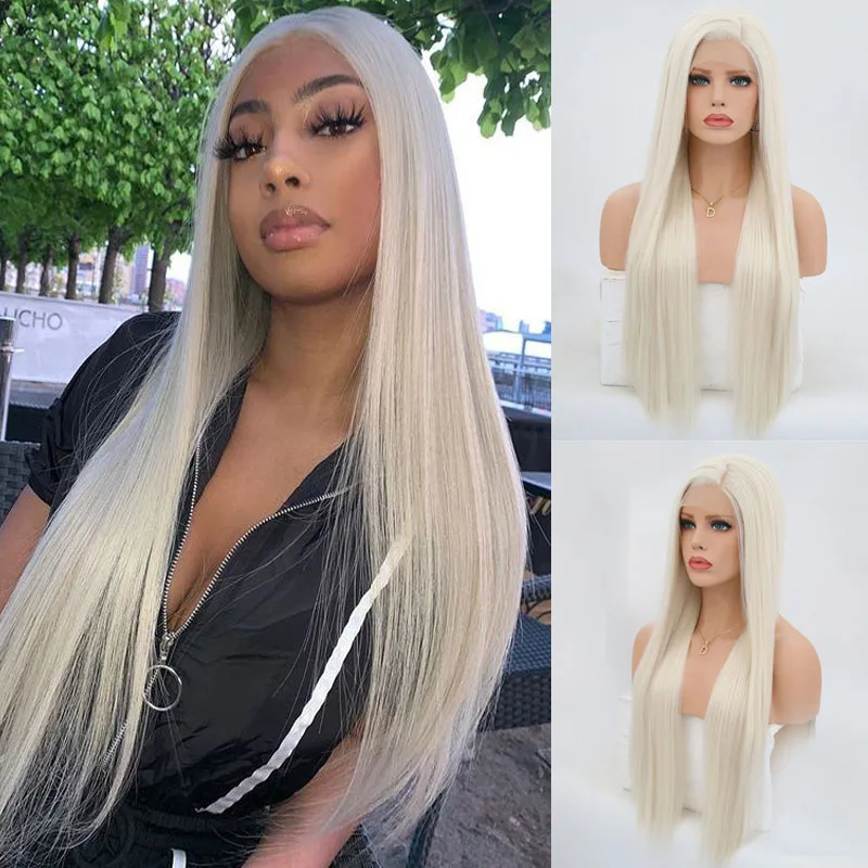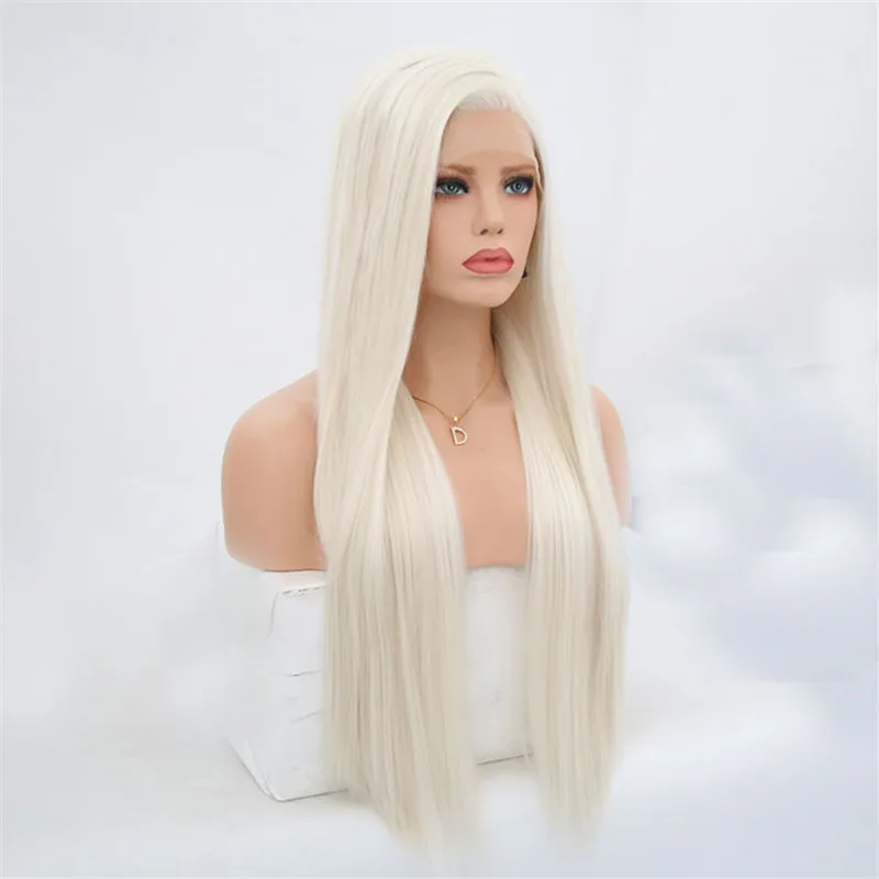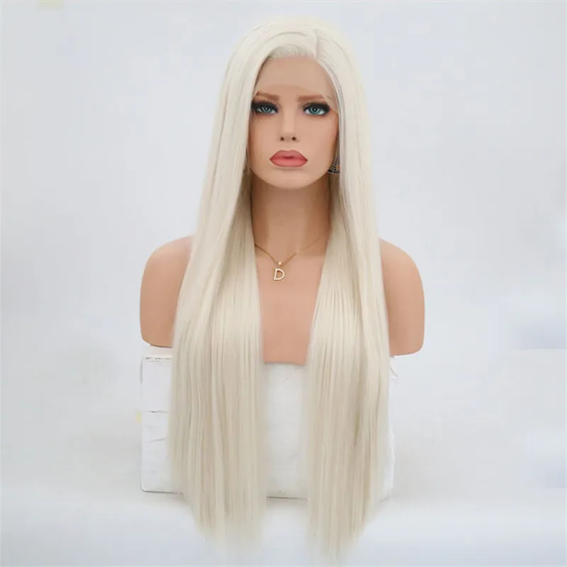 Hot Sale Rongduoyi #60 Platinum Blond Synthetic Lace Front Wigs For Women Long Silky Straight Wig Heat Resis